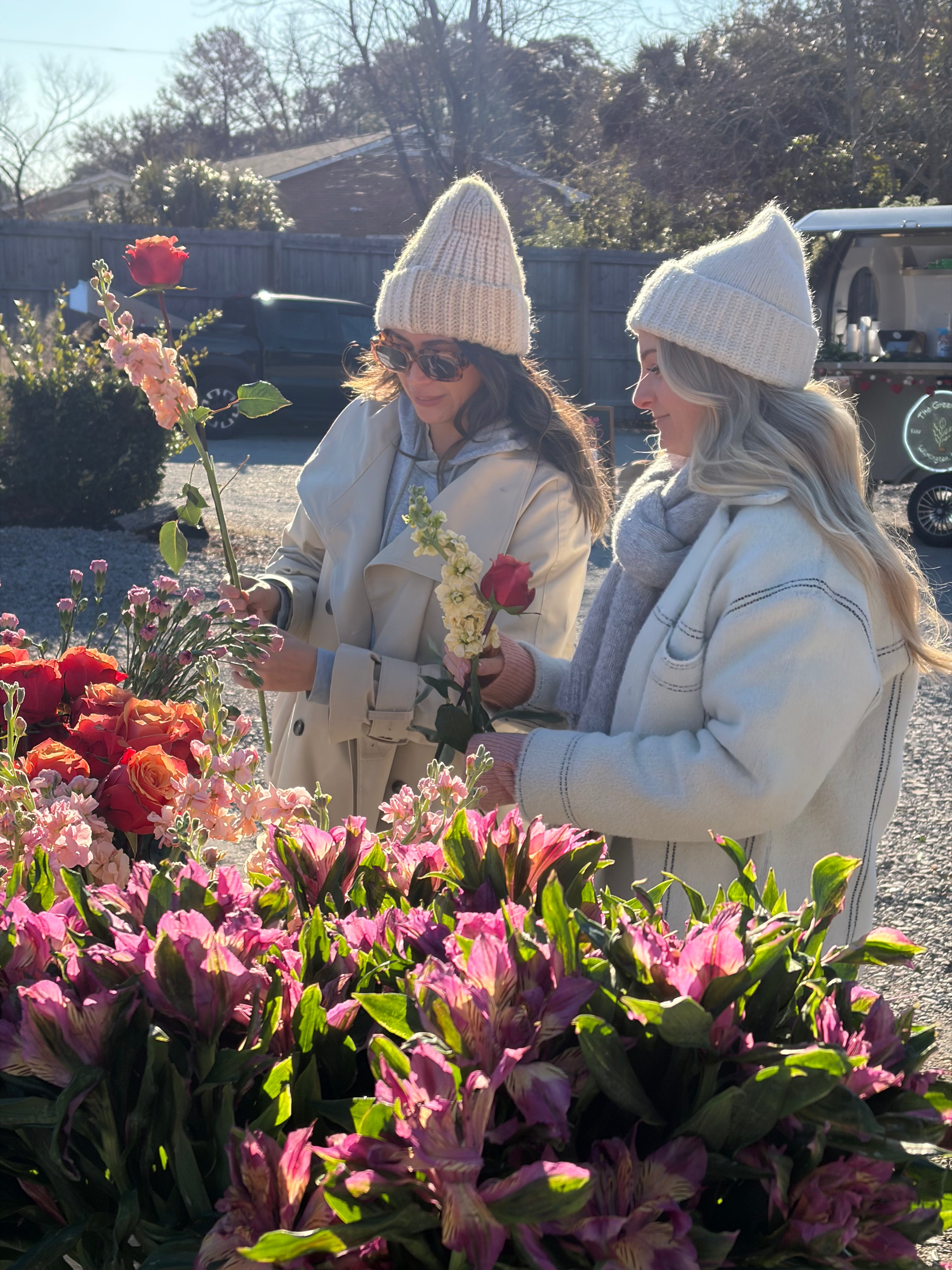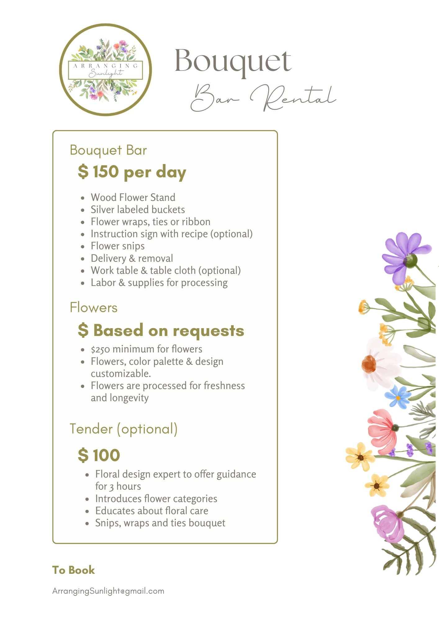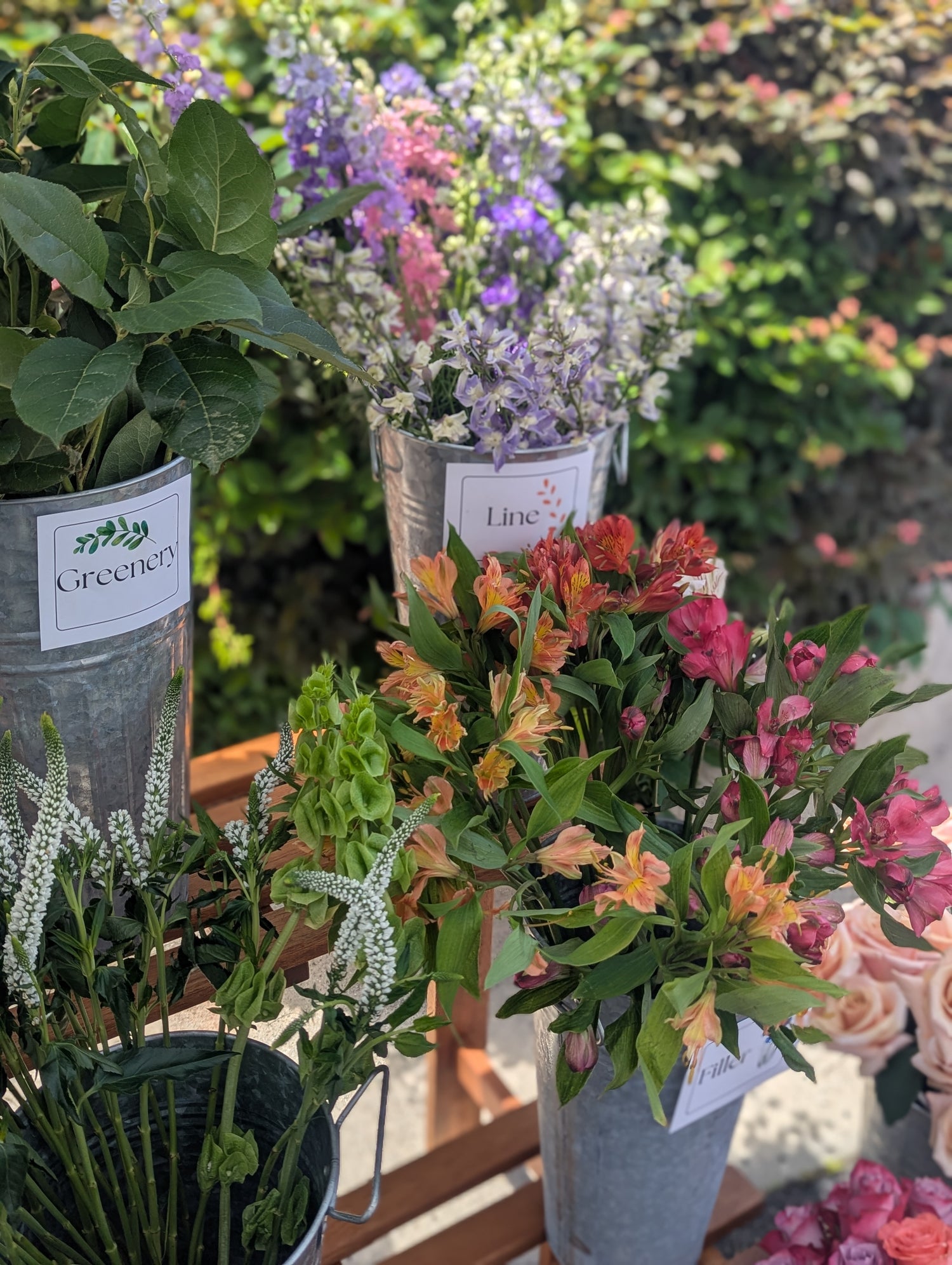 A bouquet bar is a fun, interactive flower experience where guests create their own bouquets to take home. We provide fresh seasonal flowers, a beautifully styled bouquet bar setup, and optional guidance to help guests design something they love.